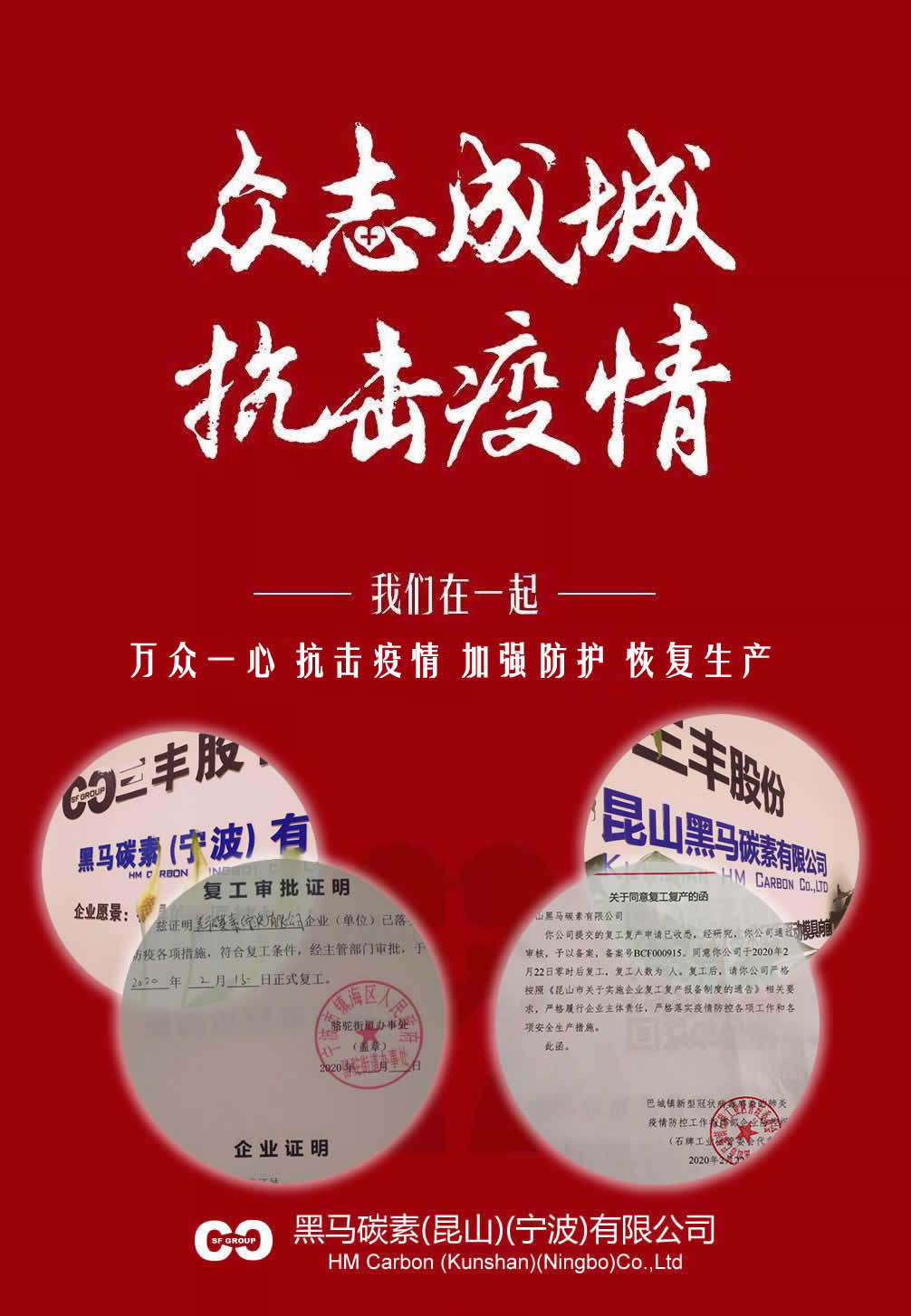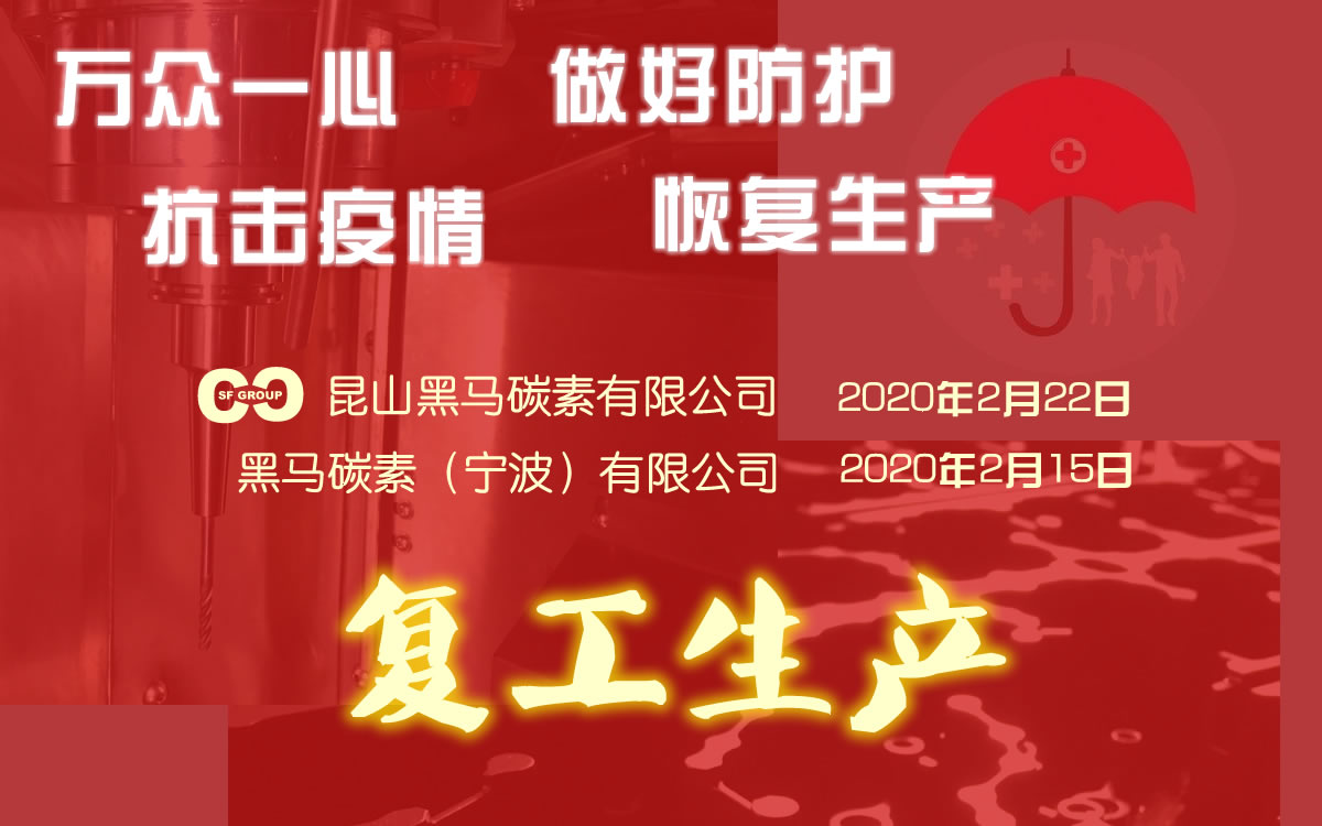 2020年初,一场突如其来的新型冠状病毒疫情,让整个中华大地始料不及;但在中国政府的强有力领导下,全国人民万众一心、众志成城,表现出了极强的民族自律性和配合性,从而有效的阻断病毒的进一步扩散传播,现全国各地企业也在逐步恢复生产,生活逐渐恢复正常;黑马碳素(昆山)(宁波)有限公司作为一个具备社会责任感的企业,始终配合政府疫情防控工作,现已获得复工批复,在此期间,感谢政府指导、感谢客户理解、感谢所有员工的配合;虽然是不可预测的突发事件,但由此造成的订单延误,我们依然深表歉意,复工后,在确保安全的前提下,我们会抓紧生产,确保后续品质交期;